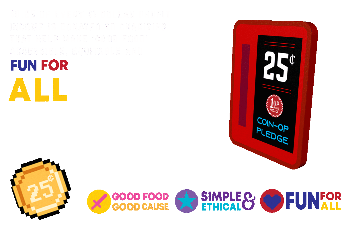 25¢ of every dollar profit pledged to charitable missions through our “1UP Coin-Op” pledge